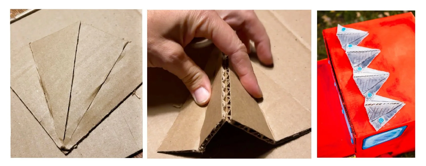 On top of the main section of the costume - I made these triangular pop ups. Just adds more color and “chrome” to the vehicle. Secure each side - while bumping the middle section up. I eventually shaded one side slightly darker with paint for a more 3d effect. We’ll get there. Good job!