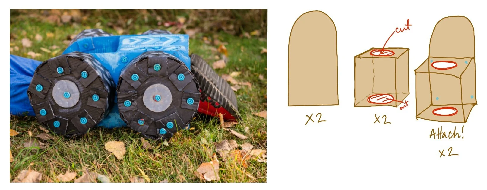 Attach 2 wheels on your right outside leg. Attaché 2 wheels stacked on the left leg. I did the attaching with Makedo Scrus. Duct tape or hot glue will work great too.