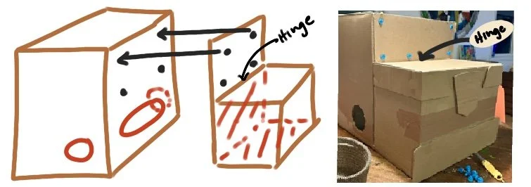 Attach bumper box to the bumper box with Makedo Scrus / tape / hot glue. Whatever works best for you! Make sure it’s secure - since this will be the hinge or the costume.